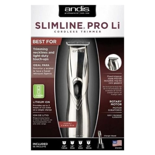 Motor 6000 rpm. Cuchilla en T de acero al carbón (ajustable a 0). Modo de uso: con o sin cable. Batería de Iones de Litio. Autonomía 120′. Incluye 4 peines (1.5 mm / 3 mm / 6 mm / 10 mm). Diseño ergonómico, acabado cromado satén para un mejor agarre y un máximo control. Base de carga incluída.
